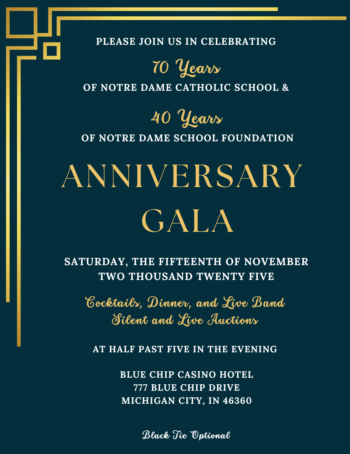 Please join us for a night of dinner, dancing, and silent/live auctions to commemorate the 70th anniversary of Notre Dame Catholic School and the 40th anniversary of Notre Dame School Foundation. We cannot wait to celebrate Notre Dame's continued success!